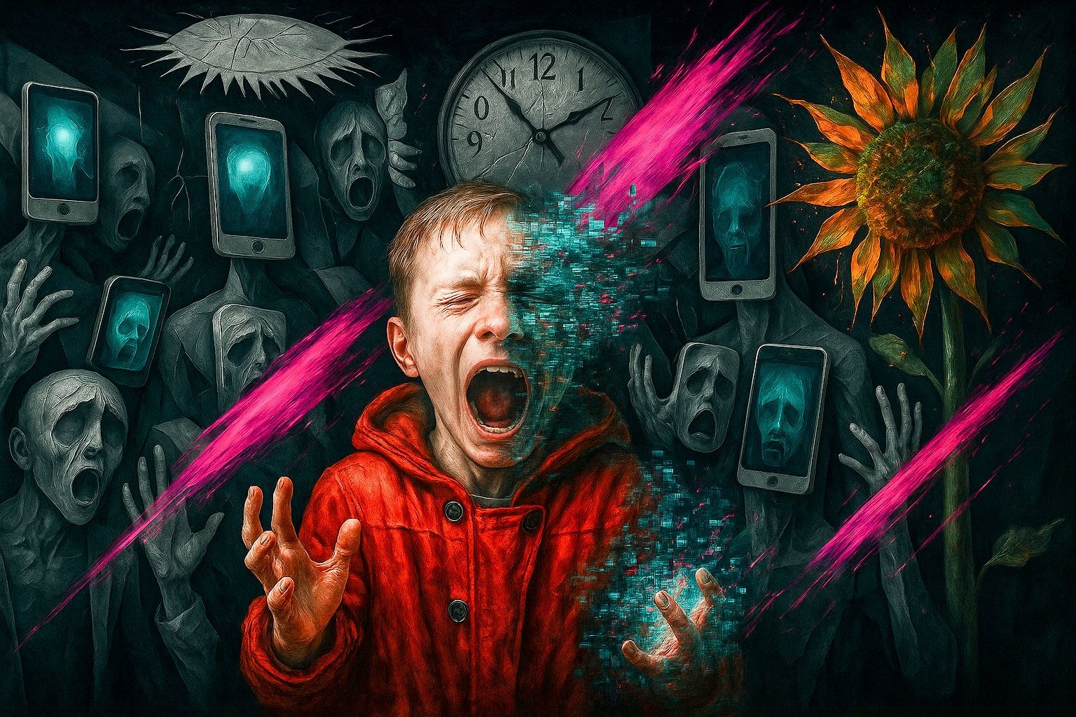 Dieses Bild entstand aus der Auseinandersetzung mit Picassos Guernica - dem Schrei gegen den Krieg. Ein Kind im roten Mantel schreit - halb Mensch, halb Pixel. Umgeben von gesichtlosen Gestalten, verschmolzen mit Smartphones.